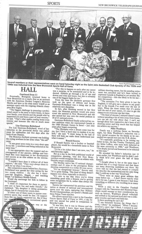 This native of Shediac, like Andrew Gunter, Arnold Parks, Donald White and Robert Kierstead before him, reminds us of New Brunswick's remarkable contribution to the sport of shooting on the national, common-wealth and international scenes. His fifteen national championships; twenty-one appearances at the Bisley competition during his nineteen years as a member of the Canadian Forces shooting team, and two years on the Dominion of Canada Rifle Association team; six Queen’s Medals; four Military World Championships; three Palma Team matches; his Green-Jacket, Morrow, Prince of Wales and Graham Trophy awards; and no fewer than twenty-seven gold medal performances are evidence of his illustrious 40-year career. In recognition of his achievements Warrant Officer Surette was enrolled in the Canadian Forces Sports Hall of Fame in 1991. From his home in Scoudouc he continues to contribute to his sport through his work locally and provincially with the Royal New Brunswick Rifle Association. Enrolled in the New Brunswick Sports Hall of Fame, June 5th, 1999.