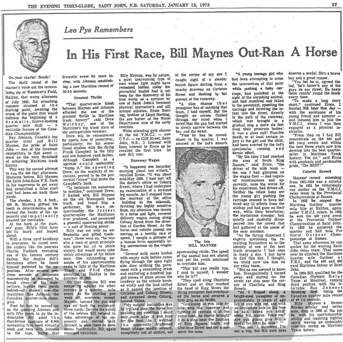 The cinder track has given way to synthetic surfaces; and the 440-yard dash has been replaced by the 400-metre sprint. But great sprinters are not the products of running surfaces and tape measurements; their greatness emanates from their ability to compete with the objective hands of the stop-watch. Bill Maynes of Saint John excelled at all he tried:he was a Rhodes Scholar, Maritime track champion, honour graduate of St. Francis Xavier University, alumnus of Oxford, and a successful business and community leader. In 1924 he represented Canada in the Games of the VIII Olympiad in Paris, and with his relay teammates, was 4th best in the world.This is a distinction that few can claim in any field of endeavour. Enrolled in the New Brunswick Sports Hall of Fame, June 7, 1986.